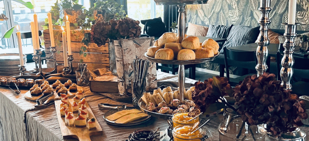Allt du behöver för en perfekt lördagseftermiddag – nybakade scones, läckra snittar, söta bakverk och ett glas bubbel